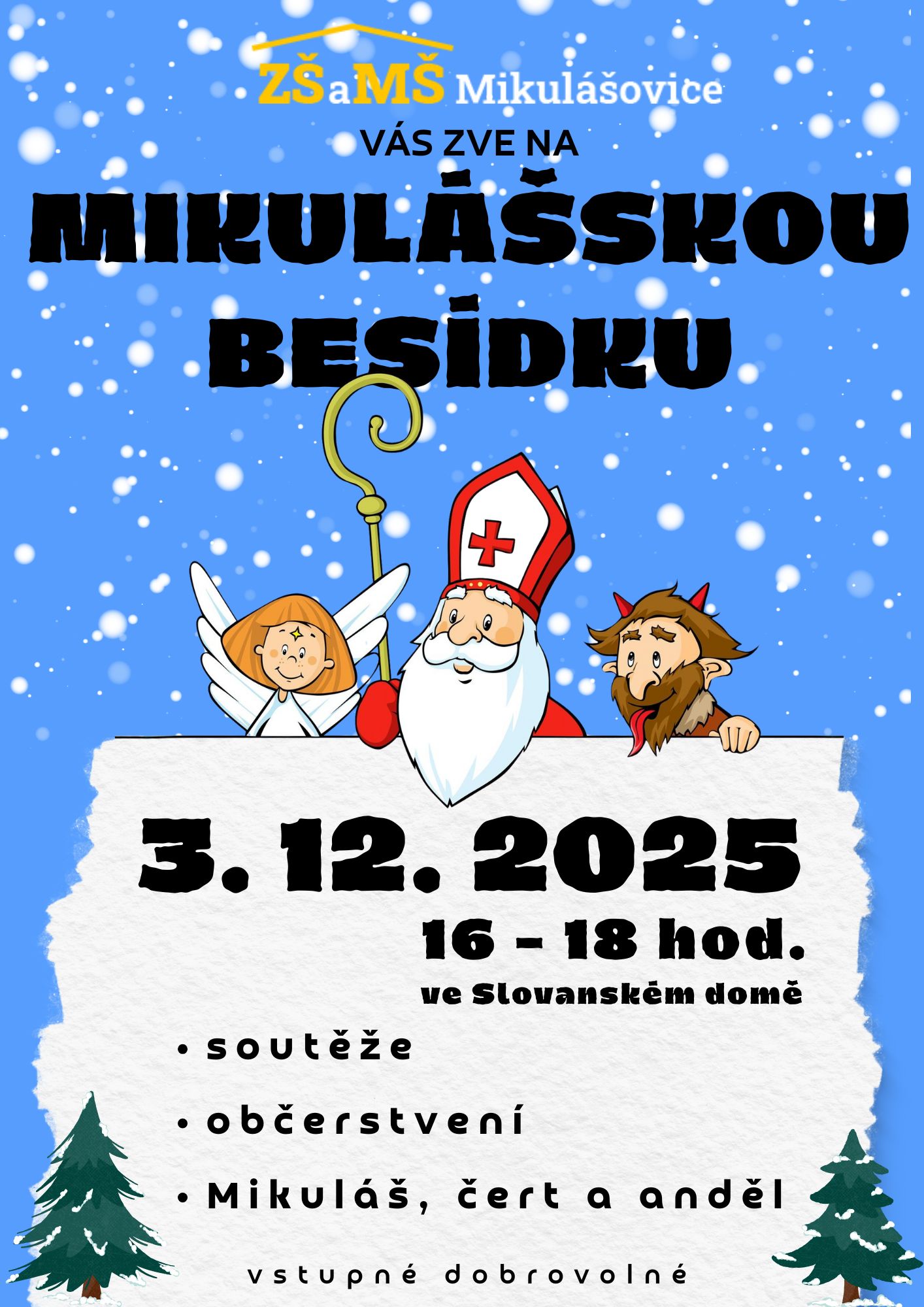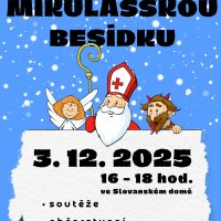 Úvod > Aktuality > MIKULÁŠSKÁ BESÍDKA MIKULÁŠSKÁ BESÍDKA Zveme vás na Mikulášskou besídku, která se bude konat 3. 12. 2025 od 16 do 18 hodin ve Slovanském domě. Děti si zde budou moci zasoutěžit a užít si odpoledne plné zábavy. Přijde i Mikuláš s čertem a andělem.