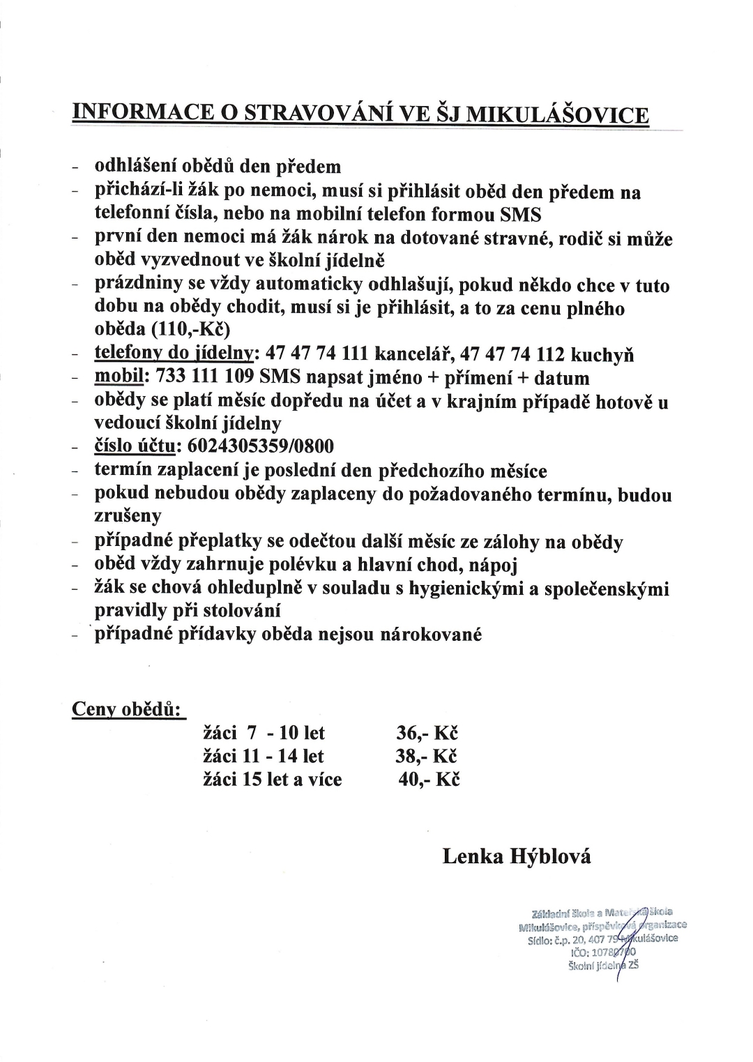 Přihlášení nového stravníka pouze v kanceláři vedoucí školní jídelny (v budově horní školy).